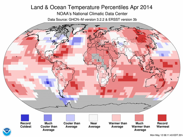 В апреле среднемировая температура побила рекорд четырехлетней давности, подсчитали американские метеорологи. Национальное управление океанических и атмосферных исследований объявило, что средняя температура на планете в апреле составила 58,1 градуса по Фаренгейту (14,5 градуса по Цельсию). Глобальные усредненные значения оказались близки к данным за апрель 2010 года и на 0,77 градуса по Цельсию превысили средние показатели за ХХ век.