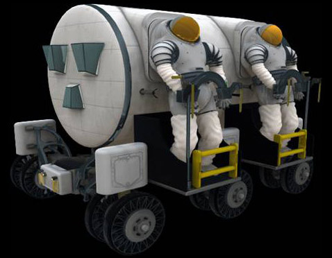 Может и упоминалось выше, но если луно- марсоход подобной компоновки и будет построен, то выглядеть он будет иначе. Нельзя распологать скафандры над колёсами, они будут изнашиваться от выброшенной пыли ( в т. ч. и от второй машины ), тем более что предполагается две недели регулярного движения. Картинка хороша для демонстрации концепции, в реальности скафандры должны быть в глубоких нишах.