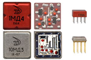 В 1964 году на заводе "Ангстрем" при НИИ точной технологии созданы первые интегральные схемы ИС-"Тропа" с 20 элементами на кристалле, выполняющие функцию транзисторной логики с резистивными связями. В НИИМЭ в Зеленограде создана технология и начат выпуск первых планарных транзисторов "Плоскость". Под руководством Б.В.Малина в НИИ-35 (ныне НИИ "Пульсар") была создана первая серия кремниевых интегральных схем ТС-100 (степень интеграции - 37 элементов на кристалле). В 1966 году в НИИ "Пульсар" начал работать первый экспериментальный цех по производству планарных интегральных схем. В НИИМЭ под руководством доктора наук К.А.Валиева начат выпуск логических и линейных интегральных схем. В 1968 НИИ "Пульсар" выпустил партию первых гибридных тонкопленочных ИС с планарными бескорпусными транзисторами типов КД910, КД911, КТ318, предназначенных для телевидения, радиовещания и связи. В НИИ МЭ разработаны цифровые и линейные ИС массового применения (серия 155).
