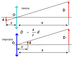 Построение изображения что в зеркале что в линзе - почти одинаковый закон. Что там что там не важно какое фокусное расстояние, а именно расстояния между объектом линзой (зеркалом) и изображением (фокусом). И если источник со своей апертурой d находится слишком близко к линзе или зеркалу (на расстоянии r), то на расстоянии фокусировки s мы получим огромное изображение D что от линзы что от зеркала.