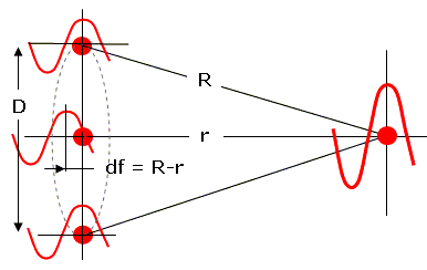 L- длинна волны. R – фокусное расстояние.  Зачем нам тогда еще одна линза? Потому что диаметр Каллисто меньше 50 000 км? Но что мешает нам разнести излучатели на те же самые 50 000 км? Создать этакий интерферометр... (меня кто то здесь это уже спрашивал но я не знал что ответить. Правда там не шло речи о синфазности).