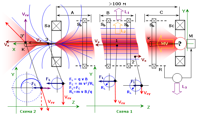 Переходим к секции В. Это типичный участок реактора. "Печка" где и горит дейтерий с гелием-3. Синим я показал силовые линии осевого магнитного поля удерживающего плазму в трубе. Видно, что силовые линии в центре (синим цветом) гуще. Здесь напряженность поля В максимальна. На схеме я показал для примера две частицы. Частица 1 находится близко к оси трубы и 2 – на ее окраине. Ниже, на "Cхеме 1" я  привел проекцию траекторий этих частиц в плоскости YZ. Поле строго перпендикулярно этой плоскости поэтому, если частица имеет компоненту скорость в плоскости YZ она будет двигаться по так называемой ларморовской окружности радиусом RL под действием силы Лоренца. Простые формулы из школьной физики показывают что радиус такой окружности зависит от массы частицы m,  ее заряда q (это все константы), напряженности поля В и скорости частицы в этой плоскости Vzy.