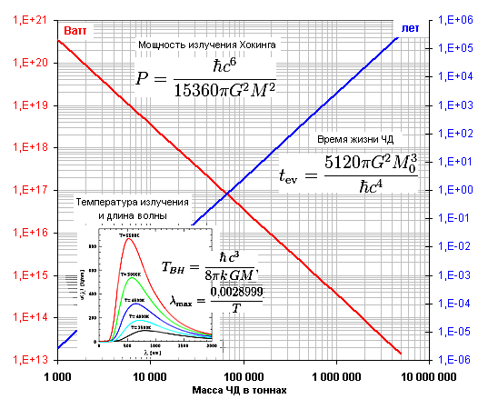 Меня заинтересовала дыра массой примерно в 60 000 тонн (пересечение кривых). Жить она будет 210 дней. Мощность ее излучения 9,93683E+16 Ватт.