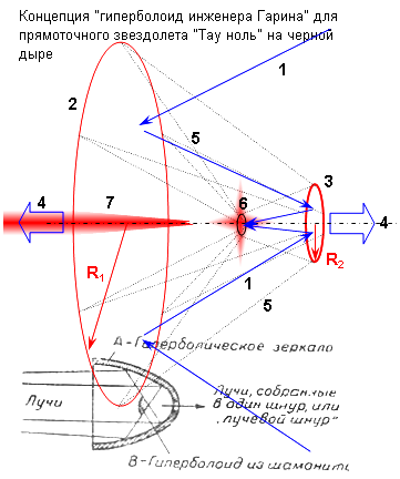 Возможно, седовало бы было поставить на его месте еще одно магнитное зеркало которое перенаправляет поток к вынесенной вперед уже совсем компактной жесткой системе 6 с черной дырой которая выбрасывает реактивную струю 7 и создает тягу. Тогда весь многокилометровый сборник из переотражающих зеркал оказался бы БУКСИРУЕМЫМ.