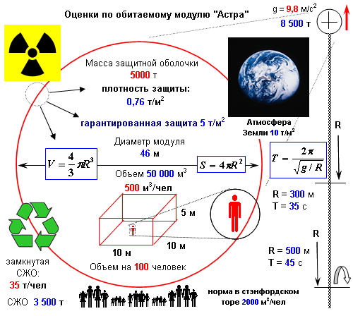 2: Радиационная защита. Атмосфера Земли создает плотность "радиационной брони" 10 т/м2. Признано, что 5 т/м2 (высокогорье) достаточно для жизни людей и воспроизведения потомства. Но даже выбрав идеальную форму кабины (сферу) и имея на радиационную броню 5 000 тонн, для 100 членов межзвездной колонии мы получаем броню в 0.76 т/м2. Условно, это слой воды толщиной 76 сантиметров.