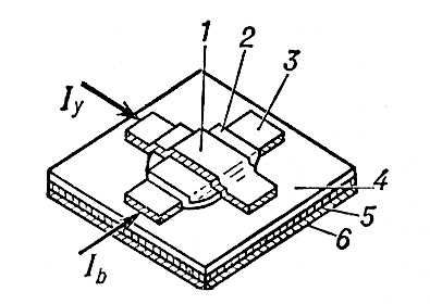 Крестообразный плёночный криотрон: 1 — управляющая плёнка (Pb); 2 — изолирующий слой (SiO2); 3 — управляемая плёнка (Sn); 4 — изоляция (SiO2); 5 — экранирующий подслой (Pb); 6 — подложка; Iy — управляющий электрический ток; Iв — управляемый электрический ток /из БСЭ/.