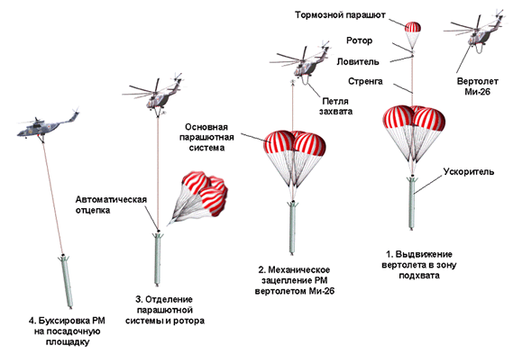 Переламывание пополам - это оттого, что блок приземлиться сам должен был, безо всякого вертолётного подхвата. Но можно использоавть конструктивно-компоновочные решения по парашютным системам.