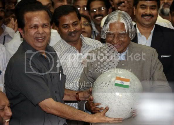 Мадхаван Наир дарит Абдул Каламу модель Луны с индийским флагом.