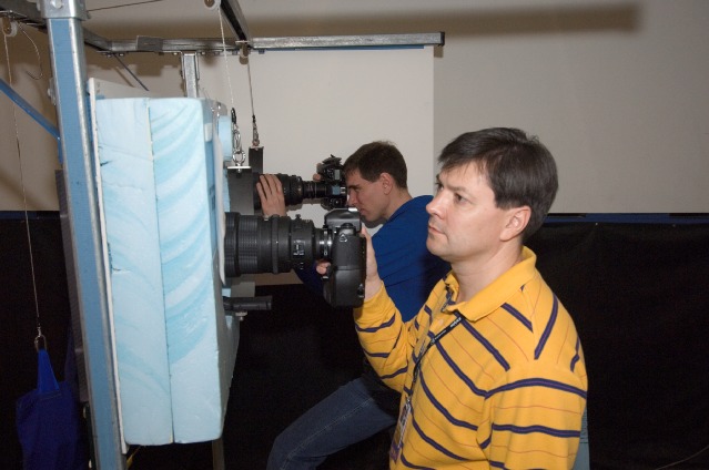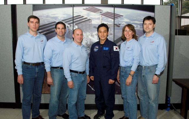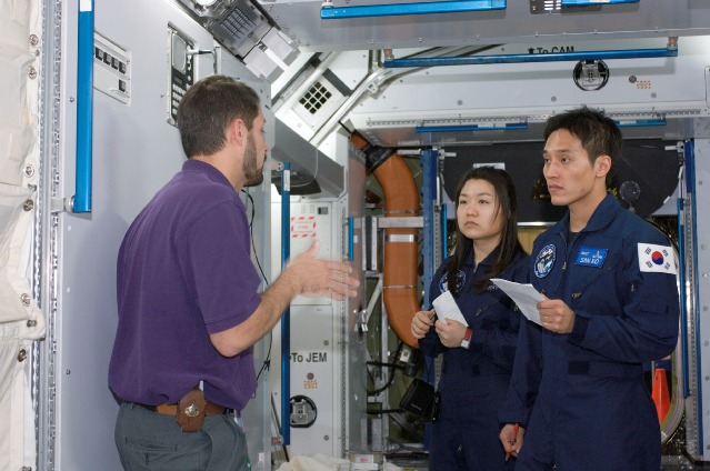 Гленн Джонстон, инструктор United Space Alliance, демонстрирует корейским участникам, как нужно правильно показывать "собачку" из "театра теней" на стене американского сегмента МКС.
