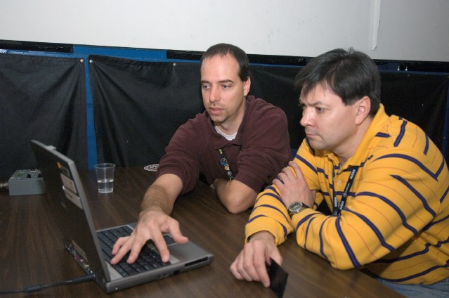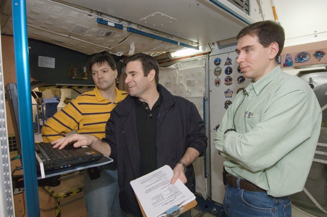 Стив Мачиандо, инструктор United Space Alliance: "Смотри Олег, чтобы открыть внешнюю дверь у нашего шлюза Quest, при открытой внутреней, надо одновременно нажать эту комбинацию из 4-х кнопок."