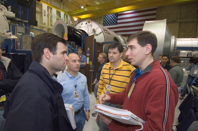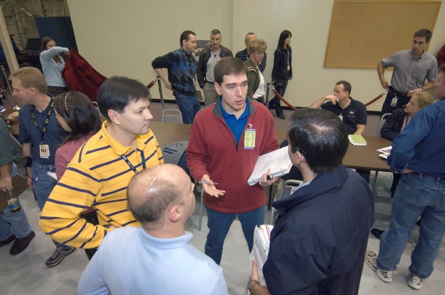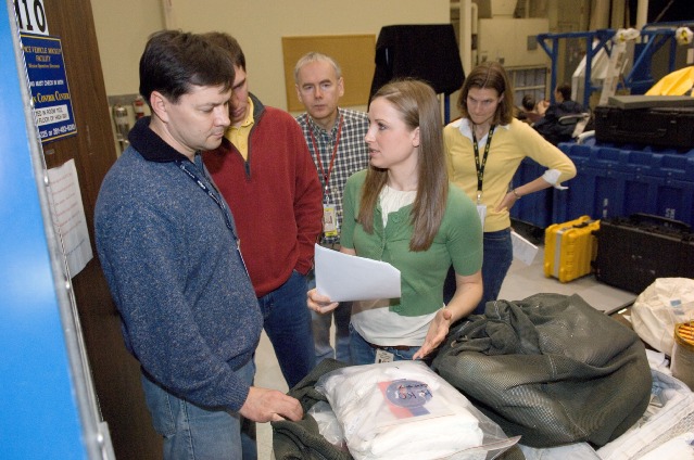 Горячая штучка Моника Грик, обратите внимание, где у нее прицеплен бейджик (сочувствую охране JSC), объясняет русским космонавтам, что в случае нештатной ситуации (contingency) им придется одеть все это белое белье, включая белые тапочки. Так же обратите внимание на выражение лица Сары Корона за спиной у Моники. Это фото лучше рассмотреть в полном разрешении.