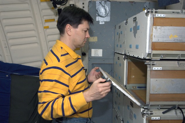 Олег Кононенко присмаривает на американском сегменте надежное место для хранения контрабаса.