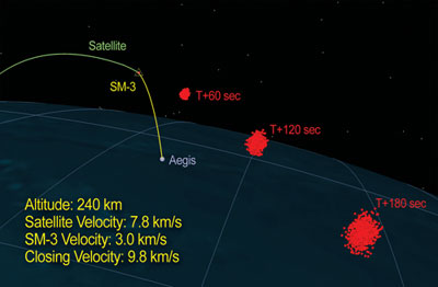 When the SM-3 missile hit USA 193 on February 20, it did not "shoot down" the satellite, but instead broke it apart: one of a number of misconceptions about the intercept. (credit: AGI)
