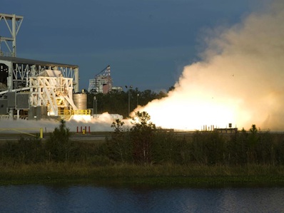 The AJ26 engine fired for 10 seconds Wednesday at NASA's Stennis Space Center. Credit: NASA