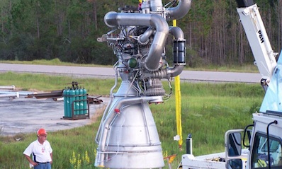 The first AJ26 production engine is moved into the E-1 test stand at Stennis earlier this year. Credit: NASA