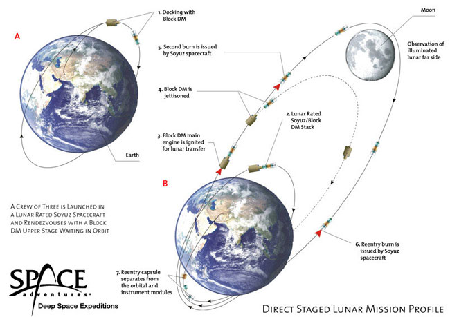 Схема полета, по информации сайта Space.com, следующая. Корабль «Союз» с двумя туристами и одним профессиональным космонавтом взлетает на ракете «Союз», затем другой ракетой на ту же орбиту выводится разгонный блок «ДМ». Космические аппараты производят стыковку, затем разгонник выводит корабль на траекторию полета к Луне и отстыковывается.