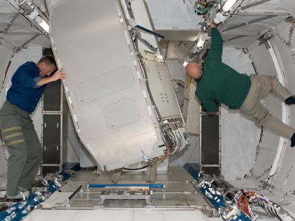 В один из дней они занимались тем, что натягивали тряпичные (?) покрывала на незанятые места в КИБО (их там много пока). Как объяснили на NSF для того, чтобы не загрязнялись контакты. Поэтому визуально ощущение, что КИБО набит полностью, хотя это не так.