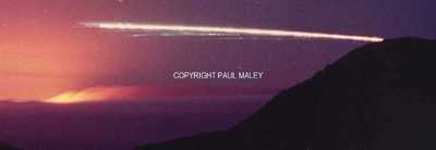 In 1990, I was fortunate enough to be situated on the island of Hawaii and witnessed the reentry of the Shuttle's External Tank (ET) from mission STS-31, the same flight that deployed that famous Hubble Space Telescope. The tank was intentionally dropped so that it would reenter the earth's atmosphere and burn up over water but in such a way that sensors in the Hawaiian Islands would be able to observe and monitor the disintegration process. The first photo shows the tell-tale rotation of the tank is it is eclipsed by a volcanic cinder cone. Note the variation in the linear streak indicating that the ET is rotating end over end. This is a video image.