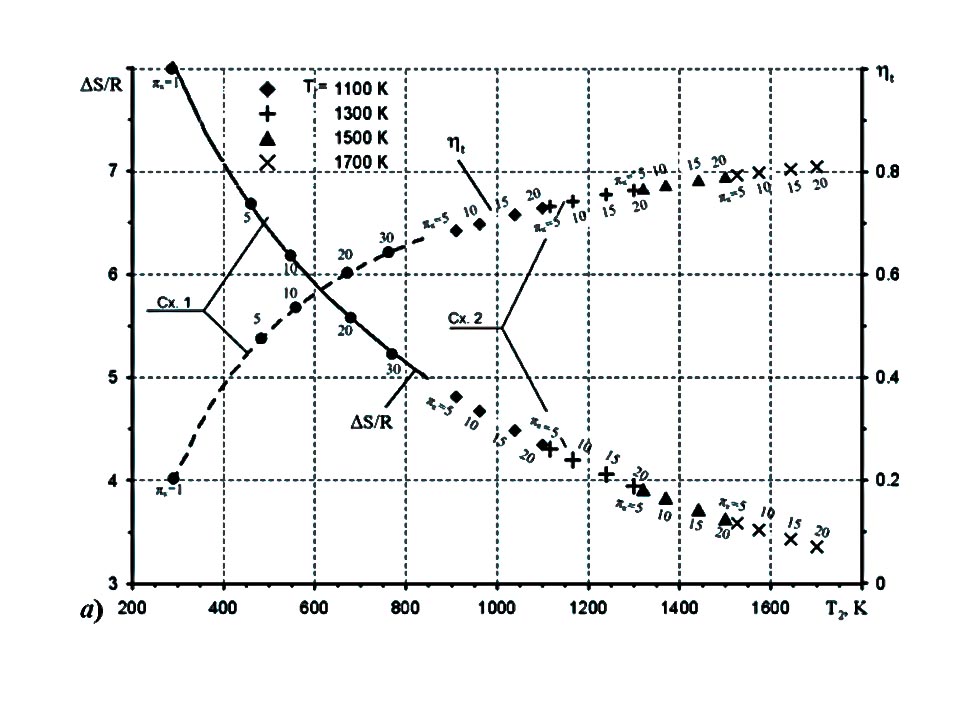 На графиках представлены полученные нами обобщенные характеристики ТМ ПуДД, показывающие зависимости их термических КПД ηt, тепловых потерь (характеризуемых отношением ΔS/R, где ΔS- прирост энтропии, а R - газовая постоянная) и удельных параметров Руд.ТМ и Cуд.ТМ от температурыТ2 подаваемого рабочего тела.