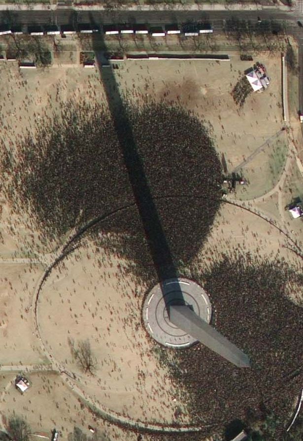 GeoEye-1 took this satellite photo of Barack Obama's inauguration ceremony. Note the shape of the crowd gathered around the large-screen TV in upper right.