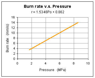 Обычно закон скорости горения - степенная функция, причём, показатель степени у любительских топлив должен быть достаточно низким, чтобы топливо было безопасным. Если аппроксимировать приведённые Наккой точки степенным графиком, там получается что-то в районе 0,36, или 0,39, и этому закону карамель реально подчиняется. Плюс-минус невоспроизводимости.