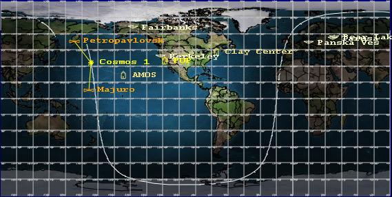 Just to close, here is a map of what we expected the ground track to be (white line) on Cosmos 1's first orbit. You can see where it was expected to go. How far it may have been from that line we just don't know. But we're feeling much better now that it may still be up there somewhere.