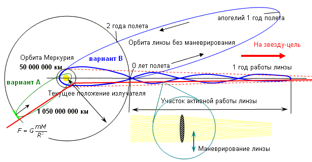 Наверное, можно придумать еще более хитрые траектории. Например, линза улетает, потом падает, потом опять улетает и опять падает на Солнце. Но это будет энергетически худшее решение. Приведенное на схеме – оптимальное.