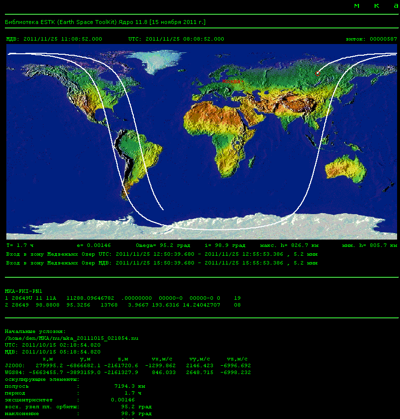 Для тестирования комплекса выполняются расчёты целеуказаний станции слежения в Медвежьих Озерах для приема сигналов с аналогичных КА.
