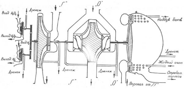 Учитывая, что соотношение объёмов баков ЖК и керосина около двух, то на наддув бака керосина уйдёт около 100 кг дармового парогаза, а на наддув бака ЖК около 200 кг кислорода.