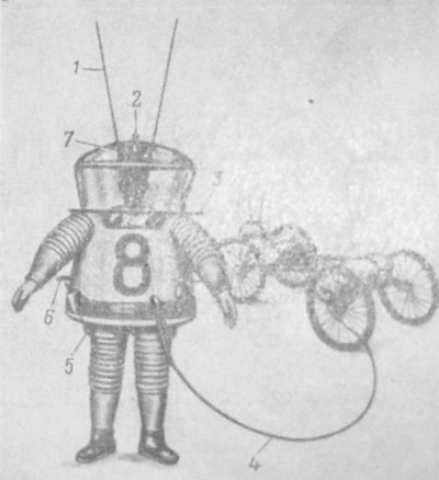 ЦитироватьТак представляют себе американские специалисты лунный скафандр и самоходную тележку: 1 — антенна; 2 — световой индикатор; 3 — амортизатор; 4 — кислородный шланг; 5 — светильники; 6 — цапфы; 7 — головной шлем.