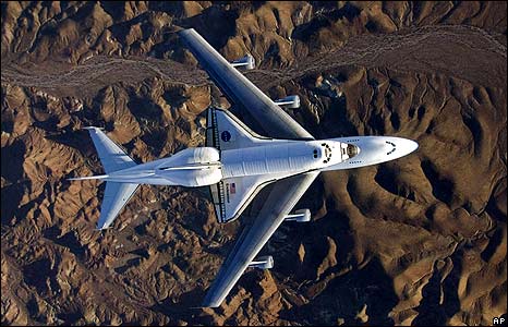 The US space shuttle Endeavour, mounted on top of a modified Boeing 747 carrier aircraft, flies over California's Mojave Desert on its way back to the Kennedy Space Center in Florida[/size].