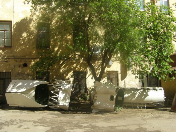 Части находятся во дворе БГТУ "Военмех". Слева направо: хвостовая часть 1 ступени с РДТТ, межступенчатый переходник, хвостовая часть 2 ступени, топливный бак 2 ступени.