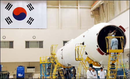According to the Ministry of Knowledge Economy. the Korea Aerospace Research Institute (KARI) is to connect the fairings that will cover the rocket's satellite payload to the tip of the second-stage rocket on Thursday.