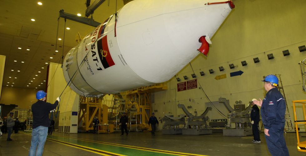 После проведения подготовительных операций КА «Ангосат» и РБ «Фрегат-СБ» перевели в горизонтальное положение и установили головной обтекатель.