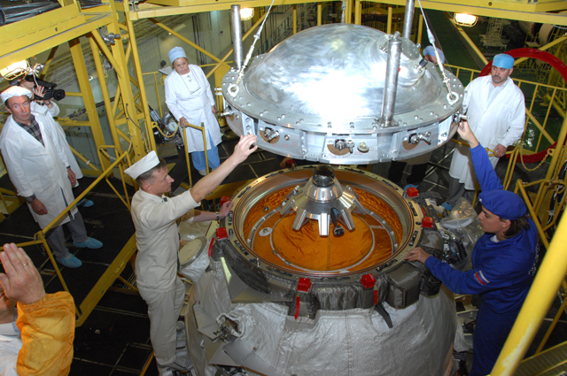 Грузовой корабль-модуль "Прогресс М-МИМ2" проверяется на герметичность в барокамере 17Т523М в монтажно-испытательном корпусе площадки 254.