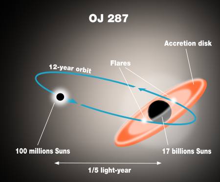 Не могу сказать, что вышеприведенная картинка как-то иллюстрирует наличие компактных деталей. А было бы интересно посмотреть, поскольку OJ287 действительно уникальный объект, это сверхмассивная черная дыра массой в 17 миллиардов солнц, вокруг которой вращается другая сверхмассивная черная дыра, массой в 100 млн солнечных. В идеале мы должны были увидеть что-то типа такого:
