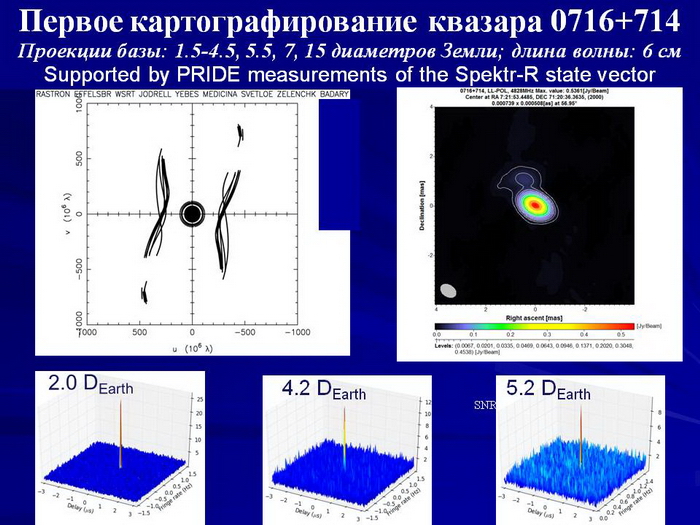 Вторая часть программы - картографирование (построение картинок активных ядер). Для построения картинки нужно много телескопов и много наблюдательного времени. Пока был проведён один эксперимент по картографированию лацертиды 0716+714 - в марте с Европейской РСДБ сетью (EVN). Эти данные ещё только-только удалось полностью скоррелировать (из-за того, что наблюдения проводились в не совсем стандартном для EVN формате, часть данных оказалась записана неправильно и потребовались большие усилия чтобы понять как их читать). Сейчас проводится сравнение выходов Московского и Боннского корреляторов. Начата пост-корреляционная обработка которая позволит получить изображение этой лацертиды.