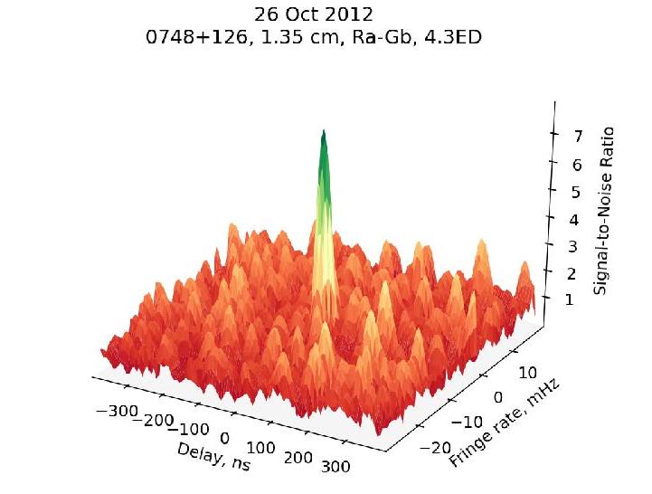 Рис. 1- Квазар 0748+126, диапазон 1.3 см, проекция базы КРТ-GBT около 4.3 диаметров Земли, отношение сигнал-шум около 8.