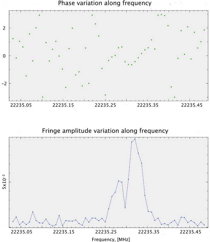 Рис. 2- Кросс-корреляционный спектр компактной детали (соответствует самой низкочастотной детали в полном спектре), полученный в комбинации из 10-м космического радиотелескопа (КРТ) и 40-м радиотелескопа в Йебесе. Время накопления составляет 570 секунд. По осям отложены: коррелированный поток излучения в относительных единицах и фаза в радианах в зависимости от частоты покоя спектральной детали в МГц, приведенной к центру Земли.