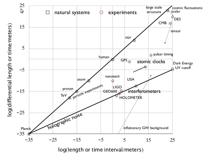 A chart showing where, if the holographic principle holds true, the holometer is just beyond the threshold of detecting holographic noise (GEO600 is on the border).