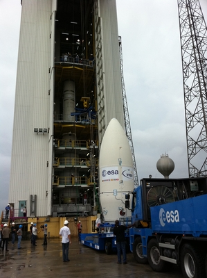 Vega assembly was completed last week with the addition of the payload composite, comprising a payload mock-up, the payload adapter and the fairing. The composite was first transferred from the payload preparation building to the launch zone and then hoisted onto the vehicle.