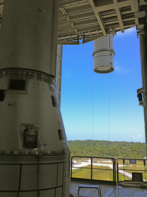 Vega's Attitude and Vernier Upper Module (AVUM) is lowered onto the stacked launcher inside the mobile gantry. This stage operates on N2O4/UDMH propellant, which is loaded through the launch pad's fixed umbilical mast. In addition to its role of inserting the Vega launcher's payload into orbit, the AVUM provides roll and attitude control during flight using a hydrazine propellant control system. The AVUM also carries main components of the launcher's avionics.