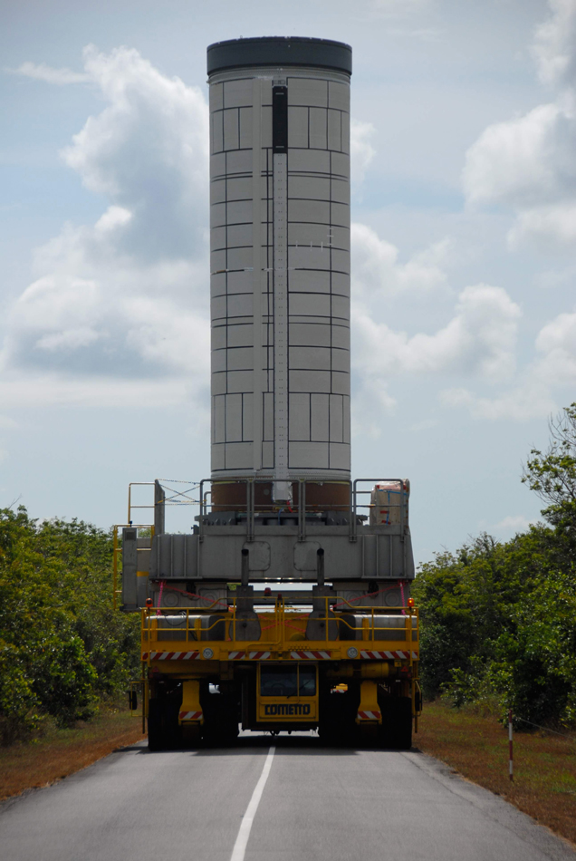 The P80 first stage was rolled out to the Spaceport's Vega launch zone on October 26 as the initial step in combined testing of Vega with its ground-based infrastructure.  This full-scale stage is complete with instrumentation, and has been filled with a simulated load of solid propellant.