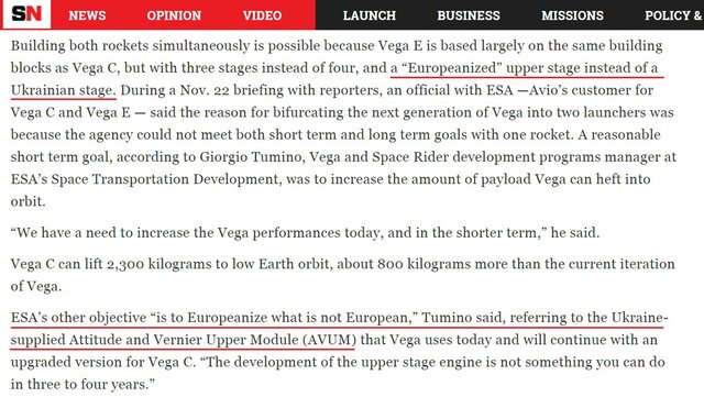 При этом он заявил о том, что ESA все же будет использовать украинские двигатели в четвертой ступени модификации Vega C по причине того, что, по словам Тумино, "двигатель верхней ступени не удастся разработать за несколько лет". Но в дальнейшем они также будут заменены на "европейские".