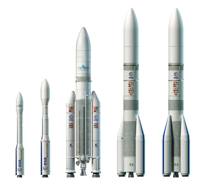 This artist's illustration shows the lineup of European rockets currently flying or scheduled to debut in the next few years. From left to right: Vega, Vega-C, Ariane 5 ECA, Ariane 62 and Ariane 64. Credit: ESA–David Ducros, Jacky Huart, 2016