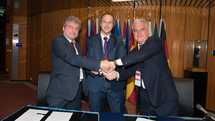 The contract concerning the Vega evolution activities worth €53 million was signed by ESA Director of Space Transportation Daniel Neuenschwander and ELV Managing Director Andrea Preve at ESA headquarters in Paris.