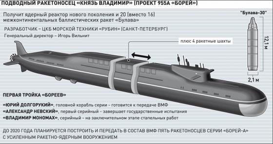 Головной корабль проекта «Борей» ─ «Юрий Долгорукий» ─ был принят на вооружение России 10 января 2013 года и вошел в состав Северного флота. Принятие в состав российского ВМФ первой серийной подлодки проекта 955 ─ «Александра Невского» ─ состоялось 23 декабря 2013 года; она приписана к Тихоокеанскому флоту. Вторая серийная подлодка ─ «Владимир Мономах» ─ в настоящее время проходит испытания, а третья ─ «Князь Владимир» ─ строится на «Севмаше».
