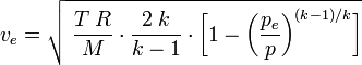 Из уравнения состояния идеального газа, и баланса энергии в газовом потоке выводится формула расчёта линейной скорости истечения газа из сопла Лаваля:[1]