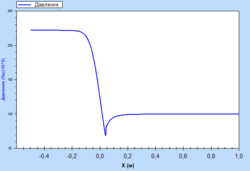 Иллюстрация работы радиусо-конического сопла на режиме перерасширения. Видно что отрыв потока произошел в сечении 0,04 метра.