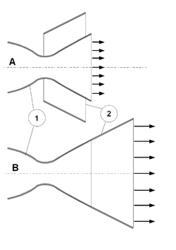 При возникновении сверхзвукового течения давление газа на выходном срезе сопла может оказаться даже меньше давления окружающей среды (вследствие перерасширения газа при движении по соплу). Такой поток может оставаться стабильным, поскольку давление окружающей среды (пока оно ненамного превышает давление газа на срезе сопла) не может распространяться против сверхзвукового потока.[источник не указан 1472 дня]